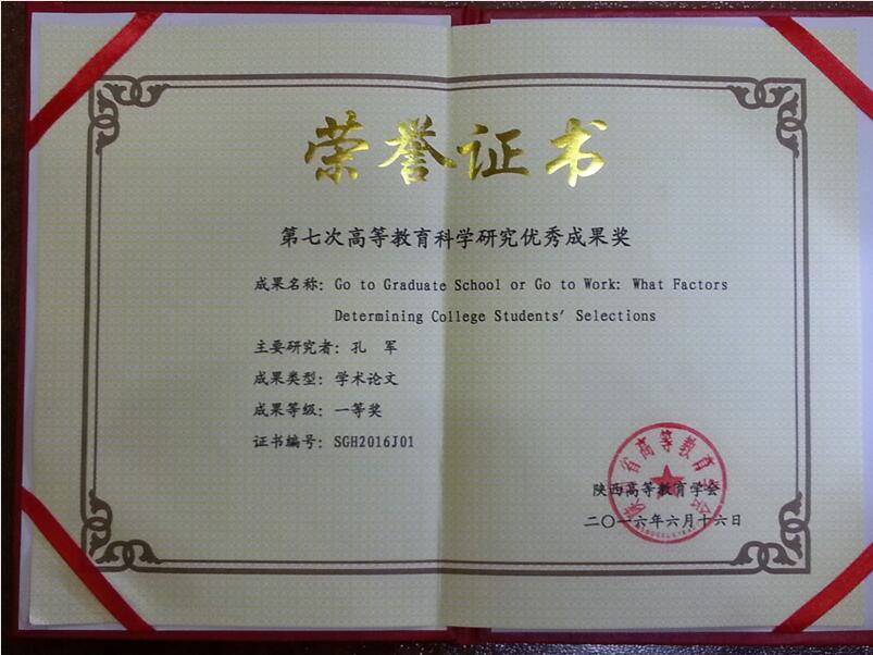 我院孔军副教授的论文《Go to Graduate School or Go to Work: What Factors Determining College Students’Selections?》获得陕西省第七次高等教育科学研究优秀成果奖一等奖,在12月3日举行的陕西省高等教育学会年会暨校长论坛上受到表彰。这篇文章在SSCI检索期刊The Anthropologist上发表(2015, Vol.19(3), pp.773-780)。