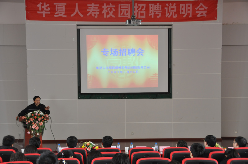 2009年3月26日上午,华夏人寿保险股份有限公司陕西分公司应邀到我院召开专场招聘会。院党总支书记薛来前老师,华夏人寿保险股份有限公司陕西分公司副总经理陶娟女士、副总经理张毅刚先生及人事部负责人出席了招聘会仪式。招聘会仪式由院党总支副书记樊涛老师主持。