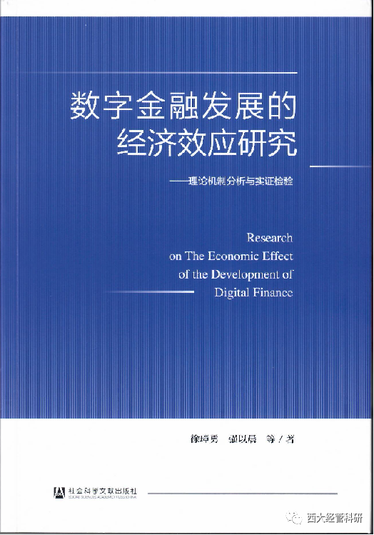 日前,由徐璋勇教授与其研究生团队合著的《数字金融发展的经济效应研究—理论机制分析与实证检验》由社会科学文献出版社出版。该书是徐璋勇教授带领其研究生团队围绕数字金融发展问题持续两年多研究的总结,也是其承担的国家社科基金重点项目《我国金融“脱实向虚”的形成机理、资源错配效应及其治理研究》(19AJL010)的阶段性成果。全书40.5万字,共包括5篇14章。第一篇“数字金融发展的基本理论及其在中国的发展”,着重从理论上分析了数字金融发展的基础条件、组织架构与运营模式、理论基础与功能机制、风险控制等,并对其在中国的发展现状进行了分析,对其研究动态进行了系统梳理;第二篇“数字金融发展对宏观经济”,分别从经济增长、货币政策效应、产业结构升级三个专题,对数字金融发展的宏观经济效应进行了理论分析与实证检验;第三篇“数字金融发展对企业发展”,分别从企业成长、企业创新、中小企业融资约束三个专题,对数字金融发展的企业发展效应进行了理论分析与实证检验;第四篇“数字金融发展对商业银行运营”,分别从商业银行运营效率、商业银行净利差、商业银行信用风险三个专题,从理论与实证两个层面分析了数字金融发展对商业银行运营的影响;第五篇“数字金融发展对居民收入消费”,分别从城乡居民收入差距、城乡居民消费、贫困减缓三个专题,对数字金融发展对城乡居民收入消费的效应进行了理论分析与实证检验。
